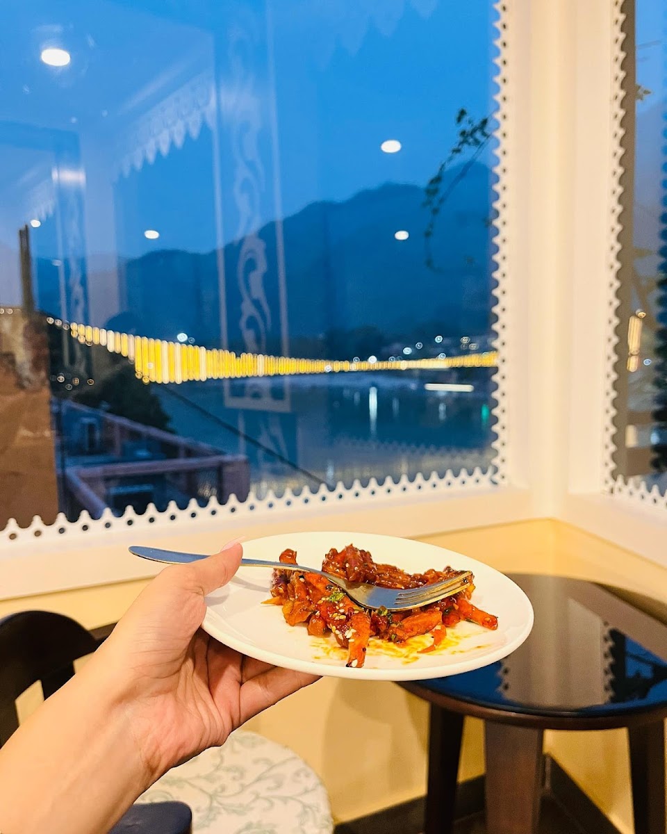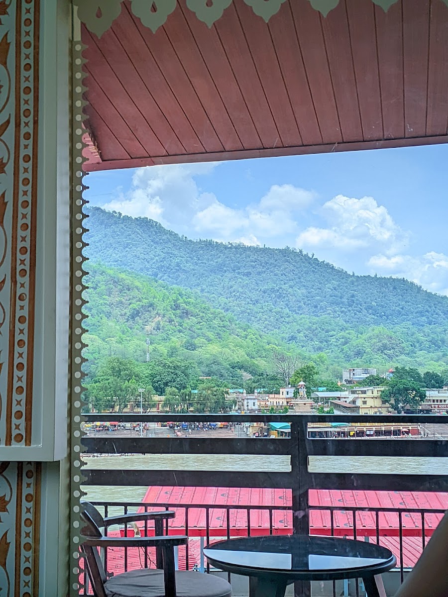 The atmosphere here is a relaxed mix of indoor seating with air conditioning and an open balcony that overlooks the river and bustling road beneath. Visitors often choose the balcony to soak in the river views and escape the town's usual hustle, making it a great stop during sunny afternoons or early evenings. The property’s traditional charm, featuring an older style building, adds a quietly nostalgic feel, aligning well with the spiritual and natural setting of Rishikesh.